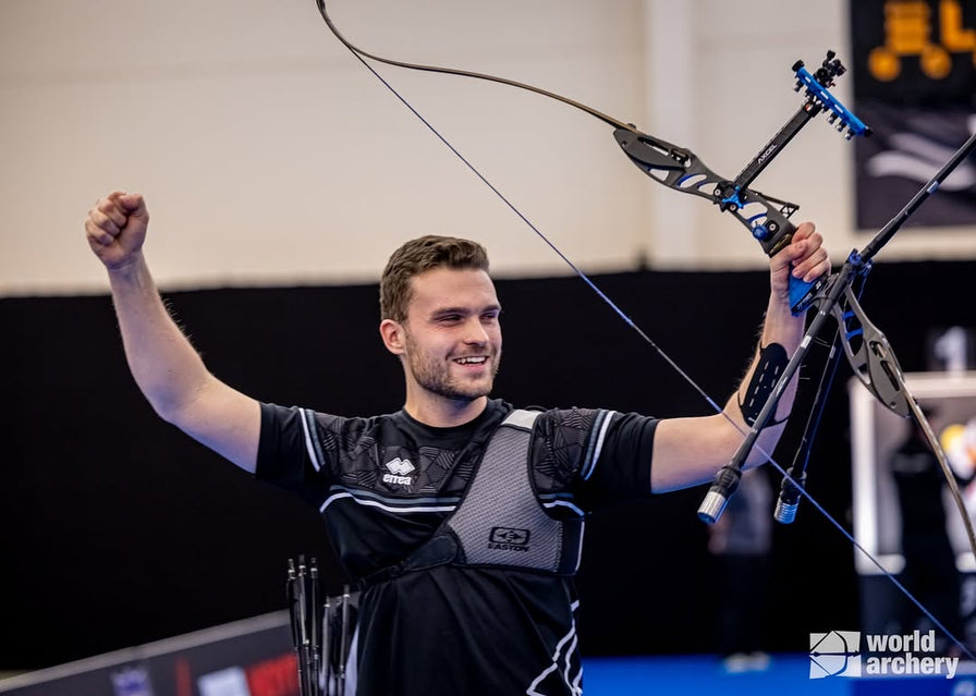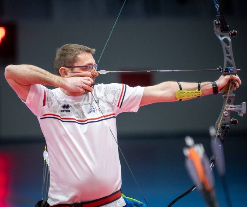 Sa configuration pour le tir salle : Easton X7 éclipse 2314, plumes naturelles 5", pointes Easton ajustables 150gr, encoches 19-2 Beiter asymétriques